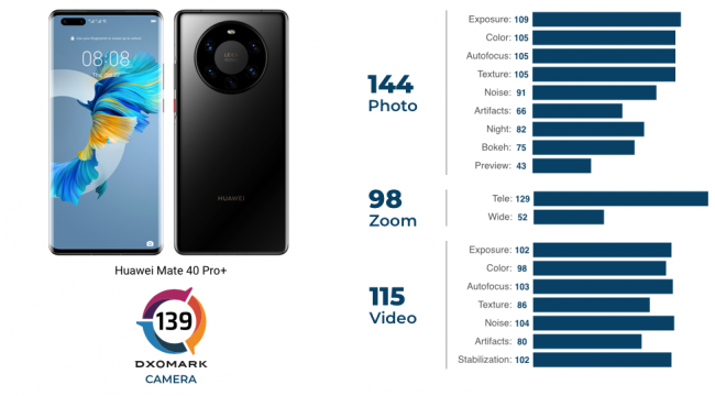 За фотовозможности Huawei Mate 40 Pro+ поставили 144 балла. За видеосъёмку он получил 115, а за работу зум — 98 баллов. Общая оценка камеры составила 139 баллов. Таким образом аппарат стал лучшим камерофоном на рынке. Он обошёл своего собрата Mate 40 Pro (136), а также Xiaomi Mi 10 Ultra (133), Huawei P40 Pro (132) и iPhone 12 Pro Max (130).