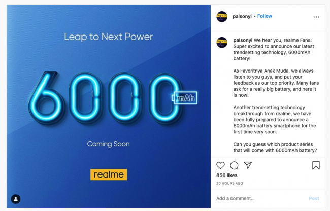 Индонезийский маркетинговый директор бренда Realme опубликовал в Instagram тизер нового смартфона с объёмным аккумулятором.