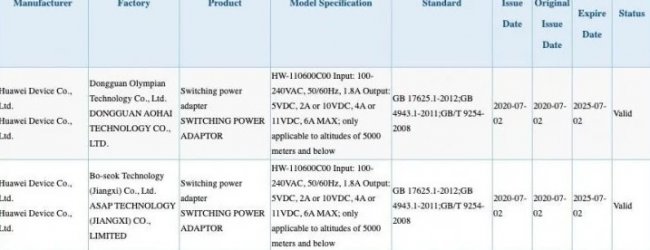 В базе данных китайского сертификационного ведомства 3C появилась новая быстрая зарядка Huawei.