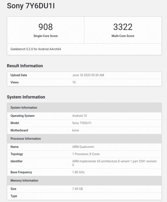 Новинка появилась в базе данных бенчмарка GeekBench с кодовым обозначением 7Y6DU1I. Точного названия, к сожалению, нет. Кстати, обычно Sony использует маркировку из пяти и шести символов, а здесь — семь.