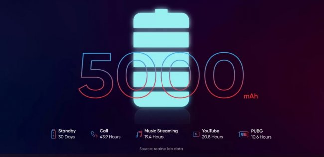 Похвастаться Realme C3 сможет ещё энергоёмким аккумулятором на 5000 мАч. Его хватит на 30 дней работы смартфона в режиме ожидания, на 44 часа разговоров, на 19 часов прослушивания музыки и на 10 часов игры в PUBG.