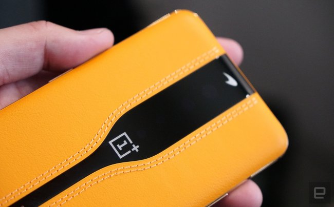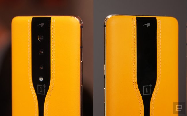 Как оказалось, смартфон выполнен в стиле McLaren — известного автопроизводителя, под брендом которого OnePlus создает премии версии своих флагманов. Задняя панель OnePlus Concept One отделана кожей, а сверху виден логотип гоночного бренда.