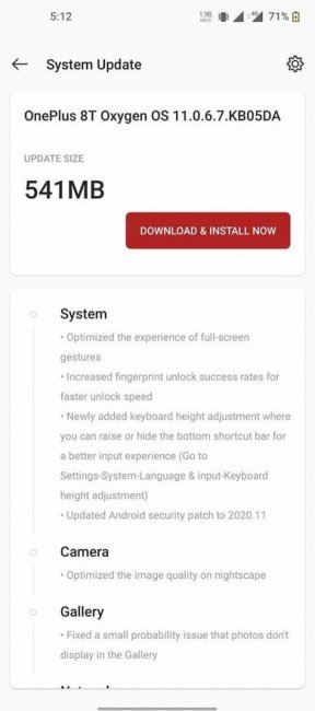 Прошивка вышла с номером сборки OxygenOS 11.0.6.7 (11.0.6.8 для Европы). Она весит 541 МБ и содержит множество улучшений. Например, разработчики добавили патч безопасности за декабрь, а также функцию, которая позволяет менять высоту клавиатуры. Это можно сделать перейдя в Настройки — Система — Язык и ввод — Регулировка высоты клавиатуры.