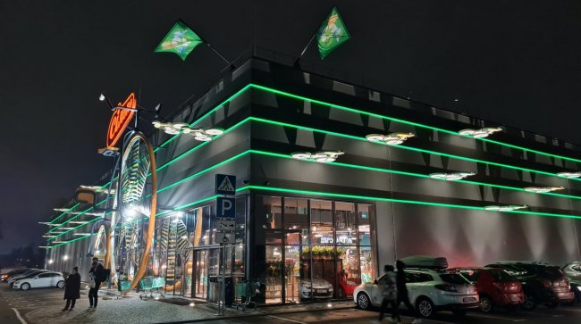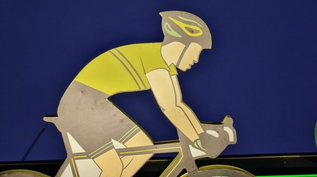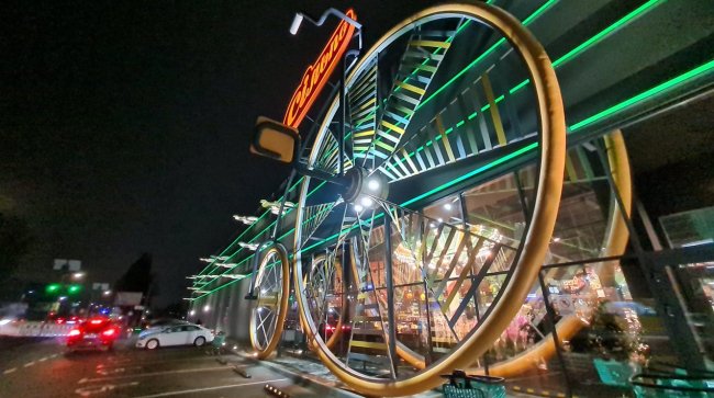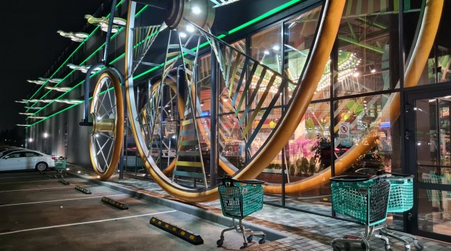 Ждал открытия нового магазина с огромной рекламной конструкцией из древнего велосипеда на фасаде. Велосипедисты появились на нем значительно раньше и интриговали местных пару месяцев. Я тоже гадал — что за велосипедный супермаркет открывается в наших краях. Снимки ночью выглядят даже эффектнее, чем днем. А велосипеды оказались частью концепции магазина, где внимание уделено зеленым технологиям (рядом есть паркинг с зарядками для электрокаров и фонари с солнечными панелями) и переработке мусора, которую и символизируют все эти окружности. У фигур велосипедистов есть фонари подсветки, что позволяет их снимать ночью с зумом как днем. Обратите внимание на серое небо на снимке с велосипедом на столбе — в реальности оно, конечно, черное, как и положено ночью, но так работают алгоритмы повышения динамического диапазона. Серое ночное небо — отличительная особенность ночных снимков, сделанных смартфоном сегодня.