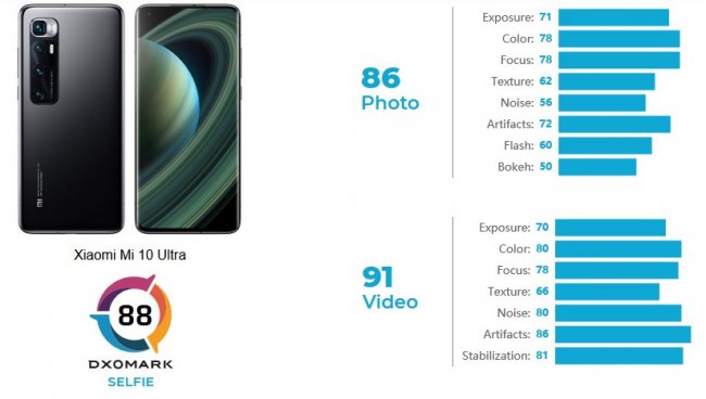 Специалисты DxOMark провели тестирование селфи-камеры Xiaomi Mi 10 Ultra и остались не в восторге. Среди ее плюсов — обычно точная экспозиция на лицах; нейтральный баланс белого в большинстве условий; эффективная стабилизация видео; хорошо контролируемый видеошум; точная экспозиция видео; приятные оттенки кожи при ярком свете и видео в помещении; хорошая детализация в видеоклипах при ярком свете.