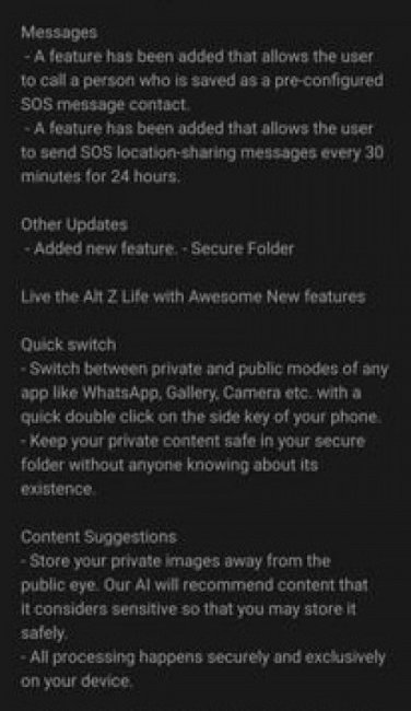 Из нововведений в систему добавили ноябрьский патч безопасности, улучшенную функцию Always-on Display, обновлённую камеру и приложение Samsung Keyboard. Кроме этого, разработчики установили в прошивку режим приватности Alt Z Life, который изначально дебютировал в смартфонах Galaxy A51 и Galaxy A71. С помощью него пользователи могут создавать защищенные папки, а также переключаться в скрытый режим в галерее, социальных сетях и т.д.