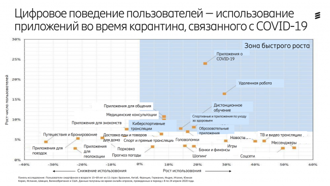 Из-за карантина в поведении пользователей произошли заметные изменения — увеличилось использование как стационарных, так и мобильных сетей. Большая часть нагрузки пришлась на сети фиксированной связи в жилых районах, где трафик увеличился на 20–100%. Однако, многие операторы также заметили рост спроса в мобильной сети. По данным исследования Ericsson Consumer Lab, 83% респондентов из 11 стран признались, что технологии помогли им во время карантина: это и спортивные программы, и онлайн-обучение. И чтобы лучше подготовиться к потенциальной второй волне COVID-19, треть опрошенных планирует вложить средства в 5G и усовершенствованный широкополосный интернет дома.