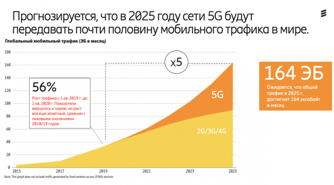 Поэтому если в ноябре 2019 года эксперты Ericsson ожидали 2,6 млрд подключений к 5G по итогам 2025 года, то теперь увеличили прогноз до 2,8 млрд. По их словам, к этому времени 5G займет 25% мобильного трафика. А уже к концу этого года число 5G-подключений вырастет до 190 млн.
