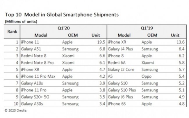 По данным Omdia Research, после iPhone 11 в списке идут Samsung Galaxy A51 (6,8 млн), Redmi Note 8 (6,6 млн) и Redmi Note 8 Pro (6,1 млн).