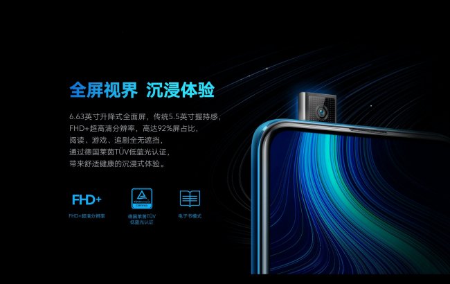 Смартфон оснастили 6.63-дюймовым IPS LCD-дисплеем без отверстий и вырезов. Поэтому фронтальную камеру разместили на специальном выезжающем механизме. Экран имеет разрешение FHD+, соотношение сторон 20:9, частоту обновления картинки 90 Гц и частоту отклика сенсора 180 Гц.