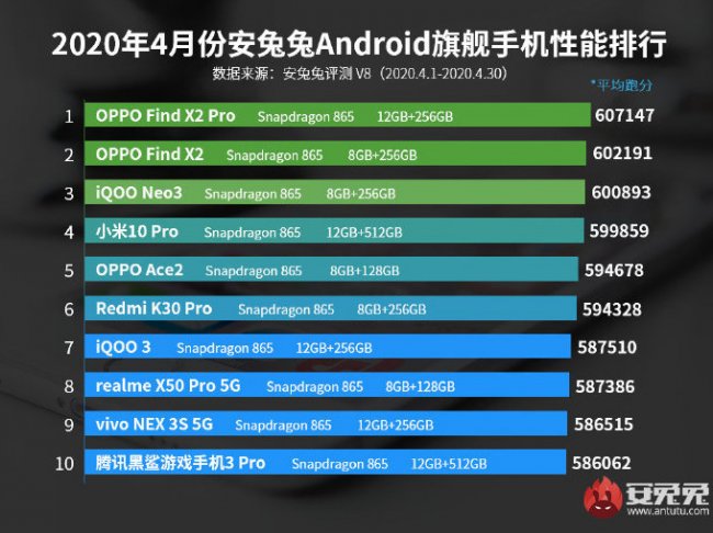Первые три позиции в списке заняли смартфоны OPPO Find X2 Pro, OPPO Find X2 и Vivo iQOO Neo3. Аппараты набирают в среднем от 600 до 607 тысяч баллов. Король прошлого месяца Xiaomi Mi 10 Pro в этот раз разместился на 4 месте. Он получил 599 тысяч баллов.