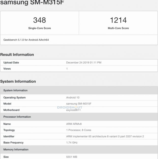 В одноядерном тесте Galaxy M31 показал результат в 348 баллов, в многоядерном — 1214.