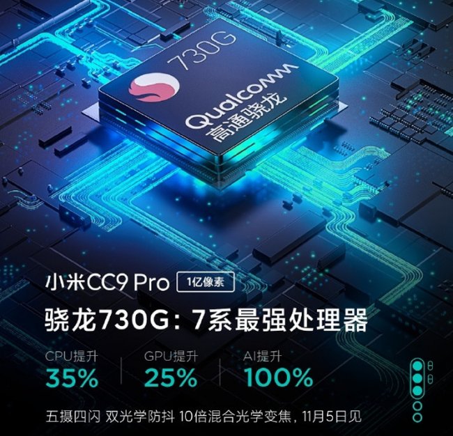 В последние дни Xiaomi опубликовала целую пачку рекламных постеров с характеристиками CC9 Pro. Во-первых, компания подтвердила, что смартфон получит процессор Snapdragon 730G, и заявляет о приросте производительности CPU на 35% и GPU на 25% и AI на 100% в сравнении с прошлым поколением (Snapdragon 710 в СС9).