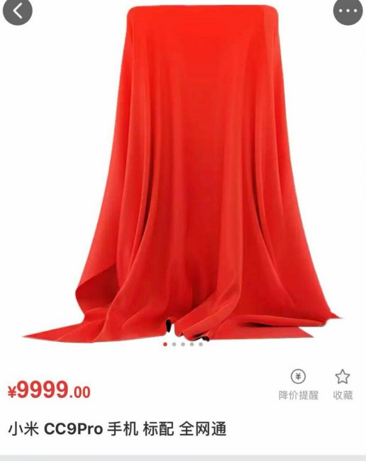 На изображении смартфон спрятан под красной тканью, а вместо цены указана стандартное число 9999 юаней.