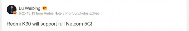 Новость исходит от генерального менеджера компании Лю Вейбинга (Lu Weibing). По его словам, Redmi K30 уже в разработке. Смартфон должен получить поддержку сети пятого поколения (5G). Это значит, что он точно будет стоить дороже предшественника, но явно дешевле Xiaomi Mi Mix 3 5G (600 евро).