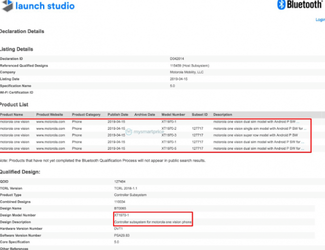 Кроме Motorola Razr, на сайте Bluetooth SIG также заметили смартфон Motorola One Vision с номерами моделей XT1970-1, XT1970-2, XT1970-3 и XT1970-5.