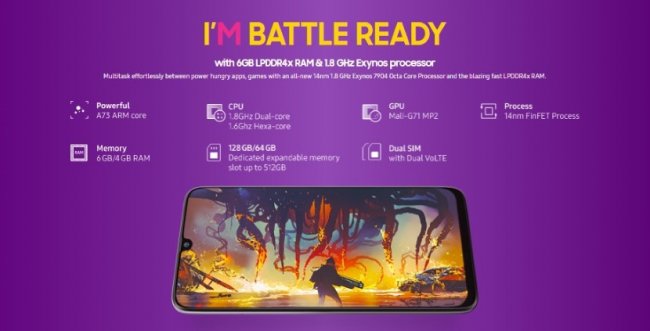 Galaxy M30 будет продаваться в двух модификациях: 4/64 ГБ и 6/128 ГБ. Есть ещё слот под карту памяти microSD до 512 ГБ. В новинке также присутствует порт USB-C, NFC, сканер отпечатков пальцев, разъём для наушников, Bluetooth 5.0 и аккумулятор на 5000 мАч с поддержкой 15-ваттной быстрой зарядки. Работает устройство на Android 8.1 Oreo с оболочкой Experience UI 9.5. Обновление до Android Pie будет, но позже.