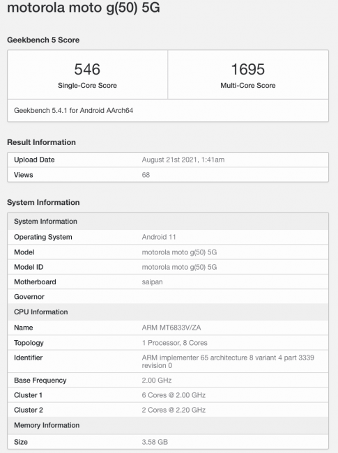 В базе данных теста производительности Geekbench заметили ещё неанонсированный смартфон Moto G50 5G под кодовым названием Saipan.