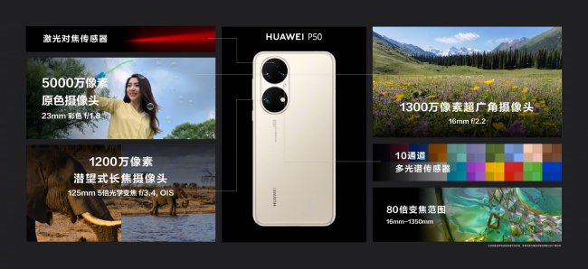 Huawei P50 стал первым смартфоном компании без приставки Pro, который может похвастаться перископным телеобъективом. Он имеет разрешение 12 Мп, диафрагму f/3,4 и оптическую стабилизацию, а кратность зума составляет 5x.