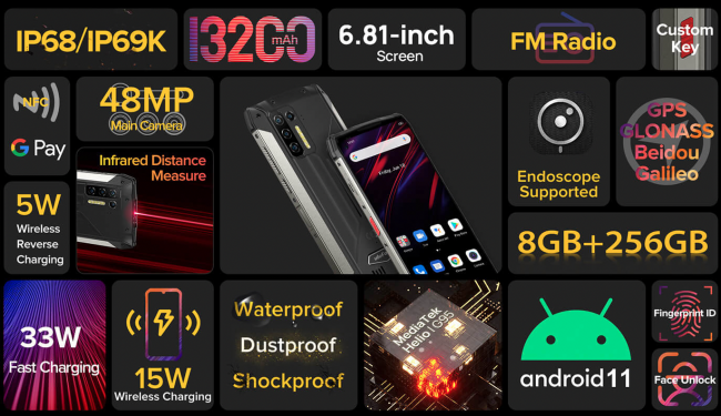 Работает Ulefone Power Armor 13 под управлением процессора MediaTek Helio G95 в паре с 8 ГБ ОЗУ и 256 ГБ ПЗУ. Встроенный накопитель можно расширить картой памяти microSD до 1 ТБ. На задней стороне смартфона разместили основную камеру с датчиками на 48 МП + 8 МП (ширик) + 2 МП (макромодуль) + 2 МП (датчик глубины). Также аппарат получил NFC, FM-радио с возможностью работы без наушников, поддержку эндоскопа (продаётся отдельно), одну настраиваемую кнопку, сканер отпечатков пальцев и инфракрасный датчик. Он позволяет измерять расстояние между объектами.