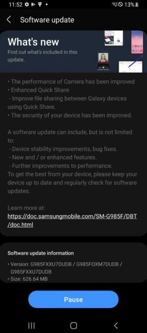 Система для Galaxy S20, Galaxy S20+ и Galaxy S20 Ultra получила номер сборки G98xxXXU7DUDB и весит около 600 МБ. В обновление добавили такой же список изменений. То есть разработчики установили майский патч безопасности, который закрывает несколько уязвимостей в системе. Кроме этого, в прошивке улучшили работу камеры, а также функцию Quick Share для быстрой передачи файлов (аналог Apple AirDrop).