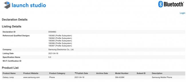 Согласно сертификации, смартфон поддерживает соединение Bluetooth 5.0. Других подробностей, к сожалению, нет, но если Galaxy Jump все-таки унаследует характеристики Galaxy A32 5G, то можно ожидать 6,5-дюймовый Infinity-V дисплей, процессор MediaTek Dimensity 720 в связке с 4/128 ГБ, аккумулятор емкостью 5000 мАч с поддержкой быстрой зарядки 15 Вт и четыре камеры на задней панели (48+8+2+5 МП).