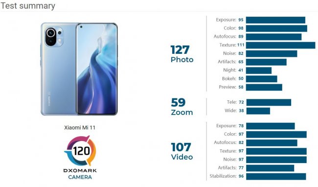 Конечно, камера смартфона не выдает такие впечатляющие результаты, как у Mi 11 Ultra. Она даже не попала в ТОП-20, получив в общей сложности 120 баллов: 127 за фото, 59 за зум и 107 за видео.