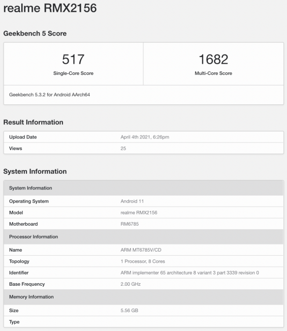 Речь идёт про обычный Realme Narzo 30. Новинку заметили в базе данных теста производительности Geekbench с номером модели RMX2156. Устройство, согласно утечке, будет работать под управлением восьмиядерного процессора MediaTek MT6785V. Это кодовое имя чипа Helio G95.