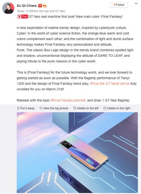 В преддверии презентации Realme GT Neo, глава китайского подразделения компании Сюй Ци (Xu Qi) опубликовал изображение новинки.