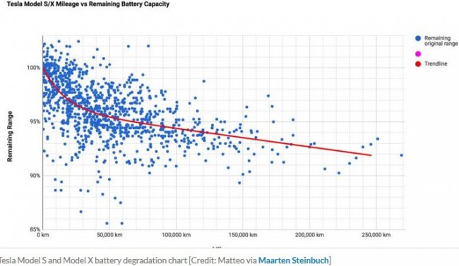 Около 900 водителей по всему миру при поддержке голландско-бельгийского форума Tesla отметили степень износа батарей своих авто в специально созданной таблице. По принципу линейной прогрессии был построен график с отмеченными на нем показателями. Задачей такого изображения было продемонстрировать, как изменяется емкость батареи автомобилей Tesla Model S и Model X на протяжении их эксплуатации.