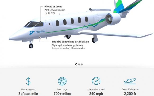 «Недавние достижения в области систем хранения энергии, легких электродвигателей и углеродных композитных материалов для фюзеляжей позволят сократить стоимость полета самолетов Zunum, примерно, до 8 центов за одну милю, что значительно меньше, чем у небольших реактивных и турбовинтовых аппаратов», - поясняет Кнапп.