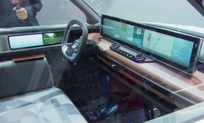 Во фронтальной части располагается большой вытянутый дисплей. Этот экран отображает основную информацию об автомобиле, в том числе уровень заряда. Дисплеи на дверях выполняют функцию зеркал и демонстрируют изображения, полученные с помощью цифровых камер.