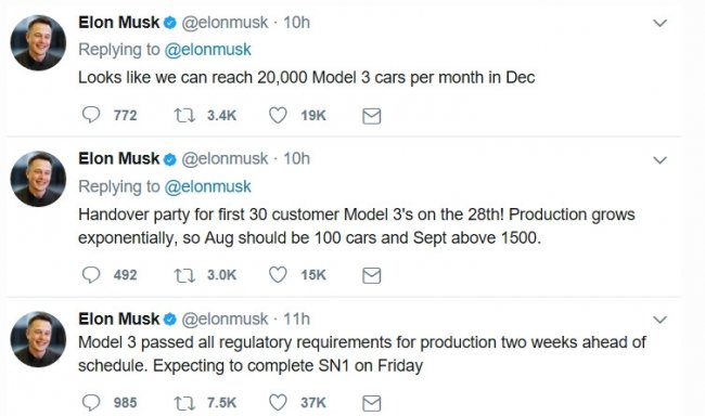 Также СЕО компании добавил, что на 28 июля запланировано торжественное мероприятие, на котором вручат ключи заказчикам от первых 30 автомобилей. А уже в декабре, по его мнению, производственные линии будут готовы к созданию 20 тыс Tesla Model 3 в месяц.