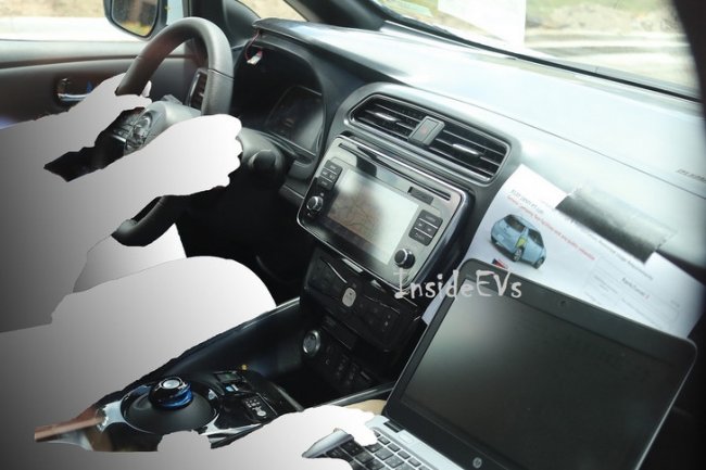Но фотошпионам издания Insideevs всё-таки удалось запечатлеть тестирование модели LEAF 2018 на дорогах общего пользования. К счастью, установленный ранее камуфляж в виде бесформенной черной ткани, теперь заменен в пользу стандартного винилового камуфляжа. Кроме того, журналисты смогли сделать первые фото интерьера обновленного Nissan LEAF.