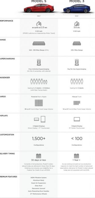 В рамках своей стратегии «антипродаж» Model 3 компания Tesla распространила таблицу, в которой сравниваются характеристики нового бюджетного электромобиля и Model S. Публикуя эти данные, производитель хочет склонить клиентов к покупке более дорогой Model S и сократить очередь на Model 3, серийное производство которой начнется только этим летом.