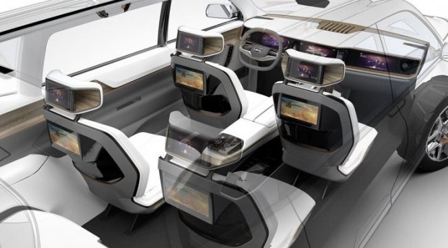 В футуристичном интерьере плагин-гибрида, помимо роскошнойотделки кожей и деревом, можно подметить «парящий» центральный тоннель, а также обилие дисплеев. Для пассажиров второго и третьего рядов предусмотрено сразу по два экрана, еще три дисплея (включая цифровую приборную панель) установлено спереди. Общее количество тачскринов и мониторов достигает одиннадцати.