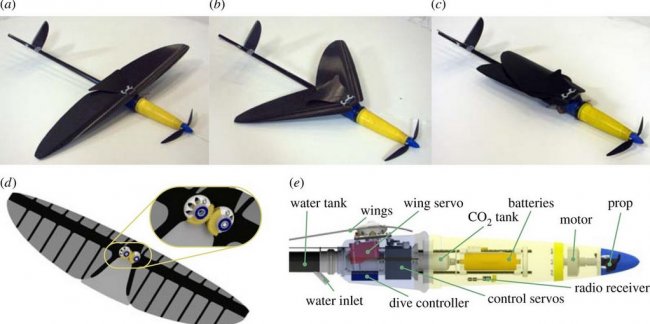 Универсальный беспилотник разработан исследователями Имперского колледжа в Лондоне, а его главной особенностью является способность погружаться под воду, бросаясь туда с высоты подобно морским птицам или летающим рыбам, складывая при этом «крылья». Авторы разработки говорят, что прообразом для их БПЛА стала Олуша (птица отряда пеликанообразных), которая отличается особым мастерством подводных нырков.