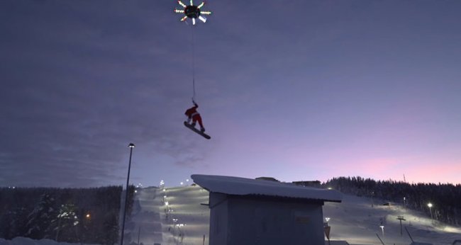 Команда любителей экстремальных видов спорта (и техники) из США сконструировала мощный дрон, который способен подымать в воздух взрослого человека. Первый в истории человечества полет был осуществлен с помощью мультикоптера и привязанного к нему сноубордиста. Свой умопомрачительный рекорд американцы засняли на зажигательное новогоднее видео.