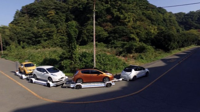 В системе IVT для автономной буксировки тележек с готовыми автомобилями между местами их погрузки и разгрузки на заводе используется доработанный Nissan LEAF.