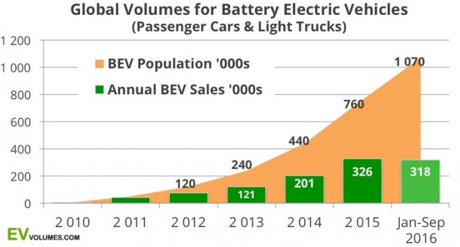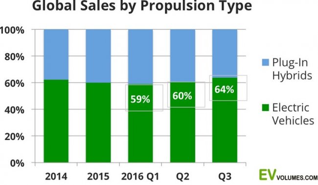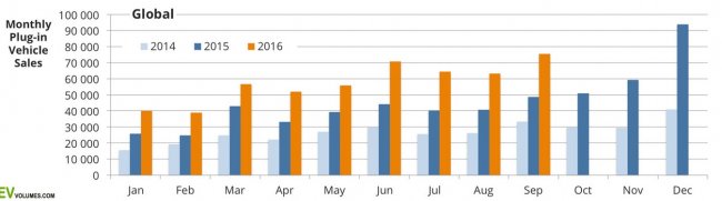 Если говорить о глобальных продажах электромобилей всех подкатегорий, то за сентябрь было продано около 75 500 единиц, что на 55% выше, чем в сентябре прошлого года. Всего за текущий год во всем мире реализовано около 518 000 единиц, что на 53% больше, чем за первые 3 квартала 2015 года.