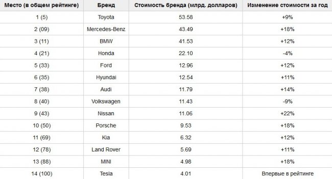 В прошлогоднем списке самых дорогих брендов мира Toyota оценивалась в 49.04 млрд долларов, Mercedes-Benz — в 36.71 млрд долларов, а BMW — в 37.21 млрд долларов. Тогда в рейтинге также было 14 автопроизводителей, в том числе Chevrolet с оценочной стоимостью 5.13 млрд долларов.