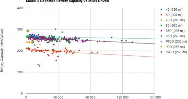 Так, они провели независимое исследование, которое показало, что потеря мощности батареи Model S даже при длительном пробеге является небольшой. В частности, блок аккумуляторов этого автомобиля в среднем теряет 5% своей мощности после преодоления машиной отметки в 50 тыс. миль (80 тыс. км), а при пробеге более 100 тыс. миль (160 тыс. км) – и вовсе менее 8%. Исследование было проведено на основе данных 500 электрокаров Tesla Model S, суммарный пробег которых составил более 12 млн миль (20 млн км).