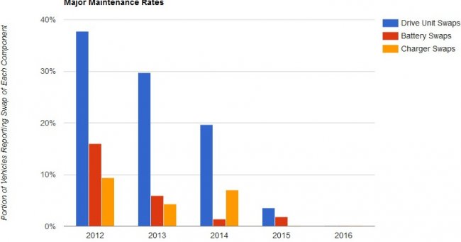 Емкость батареи может зависеть от нескольких факторов, таких как частота полной зарядки емкости, периоды времени пребывания в незаряженном состоянии и количество быстрых зарядок. Данные Plugin America также показывают, что коэффициенты замещения для основных компонентов значительно улучшились: