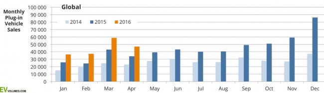 В текущем году в Китае и Европе рост замедляется, в то время как США и Японии увеличивается. В апреле во всем мире продажи увеличились на 42% в годовом исчислении. В США по-прежнему не хватает импульса от новых, важных моделей, таких как Volt Gen-2 и Tesla Model X.