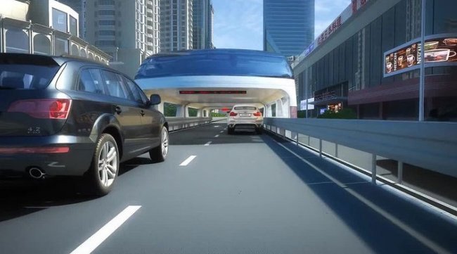 Огромный электробус, который также именуется «straddling bus», будет охватывать две полосы движения и перевозить до 1400 пассажиров. Скорость его будет доходить до 60 километров в час, а сам он будет двигаться выше уровня улицы по специальной трассе, позволяя обычным автомобилям с высотой до 2 метров свободно проезжать под ним.