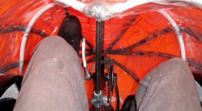 Средняя скорость этой чудо-техники 25 километра в час. «Кузов» одноместного веломобиля – это скотч и несколько слоев мебельной пленки. Этот дешевый материал Алексей подобрал после нескольких неудачных проб и экспериментов с дорогими аналогами.