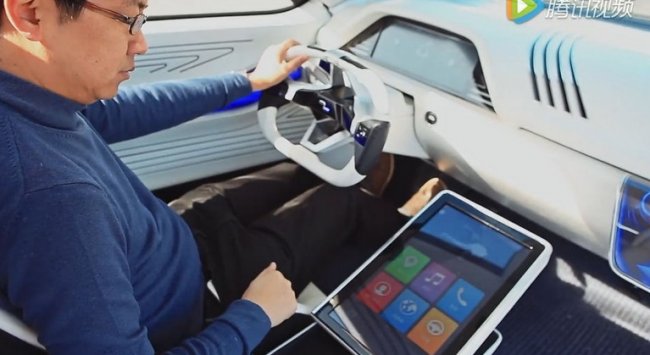 Салон китайского «автомобиля будущего» уж очень напоминает концептуальный: смотрится он эффектно, однако о практичности инженеры, похоже, не очень заботились. Овальный руль неудобен при быстром вращении, мультимедийный планшет расположен слишком низко и отвлекает водителя, зеркал заднего вида нет — вместо них две камеры, передающие изображения на два небольших дисплея по углам передней панели.