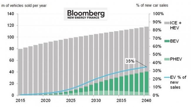 В результате доля электрокаров на рынке вырастет до 35% от рынка и к 2040 году достигнет глобальной цифры в 41 миллион штук. Это почти в 90 раз больше, чем в 2015 году, за который было продано около полумиллиона электрических батарей. Получается, что электрокары будут представлять четверть потока на дороге.