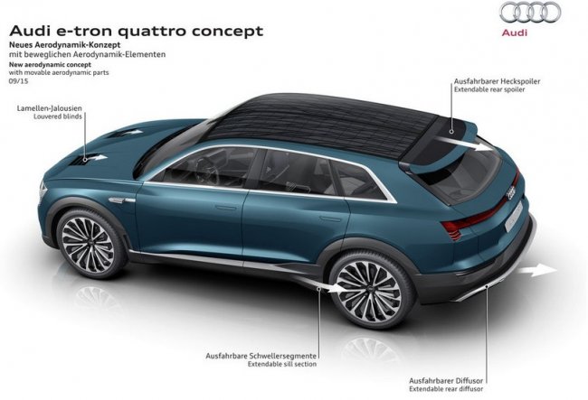 Тяговая батарея электрокроссовера мощностью 95 кВт*ч обеспечит запас хода до 500 км. С помощью станций быстрой зарядки восполнить запас аккумуляторов можно будет за 50 минут, кроме того, предусмотрена возможность использования беспроводной зарядки. Также, новый автомобиль будет иметь лучший (по заявлению инженеров Audi) в семействе вседорожников коэффициент аэродинамического сопротивления равный 0,25.