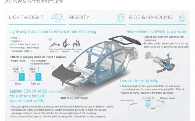 Также в комплектацию войдут трансмиссия с двумя сцеплениями и 6-ступенчатая коробка передач. В пресс-релизе Hyundai сообщается, что гибриды Ioniq будут основаны на «полностью новой архитектуре», которая включает кузов из легких алюминиевых сплавов для увеличения топливной эффективности, усовершенствованную систему безопасности, более низкий центр тяжести и прочее.